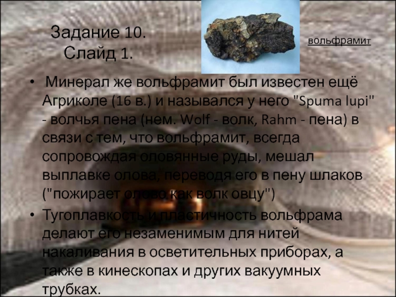 в.) и назывался у него "Spuma lupi" - волчья пена (нем. Wolf - волк, Rahm - пена) в связи с тем, что вольфрамит, всегда сопровождая оловянные руды, мешал выплавке олова, переводя его в пену шлаков ("пожирает олово как волк овцу")