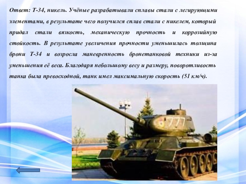 Слайд 23Ответ: Т-34, никель. Учёные разрабатывали сплавы стали с легирующими элементами, в