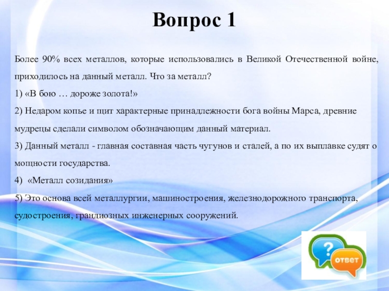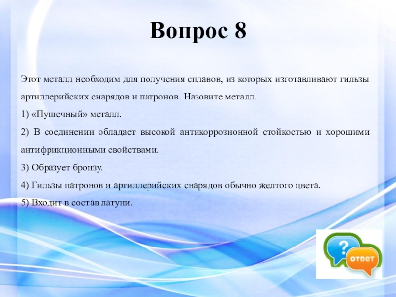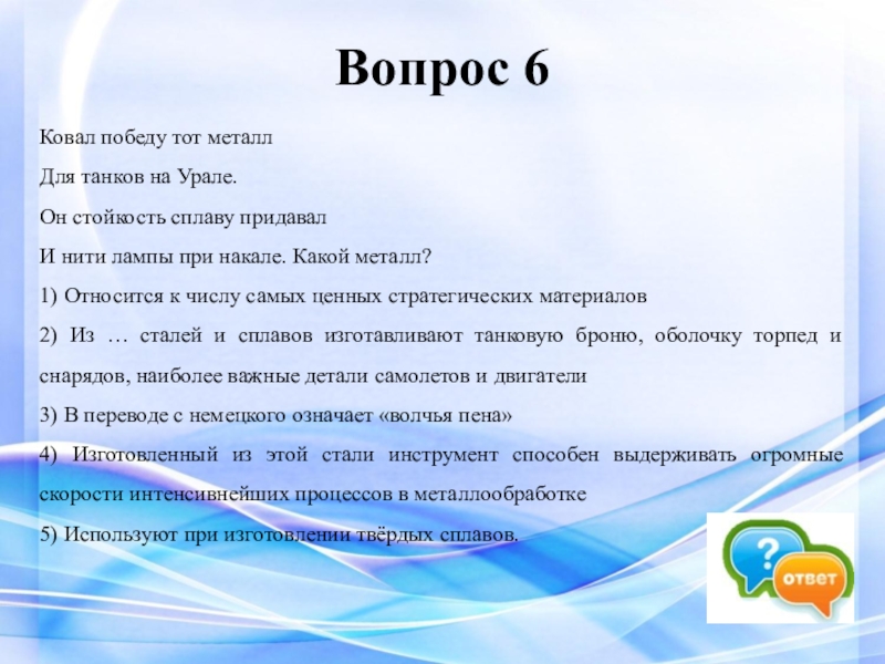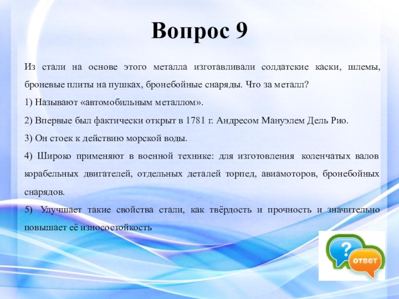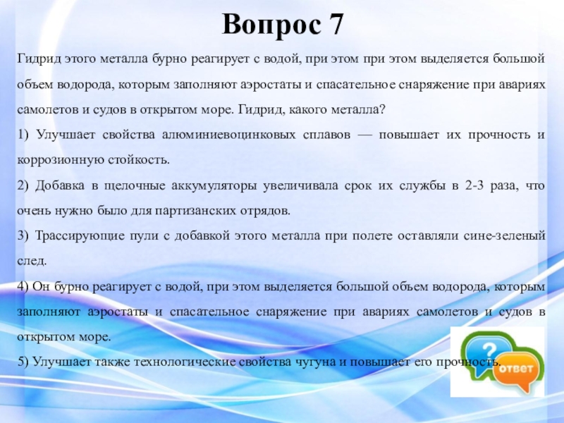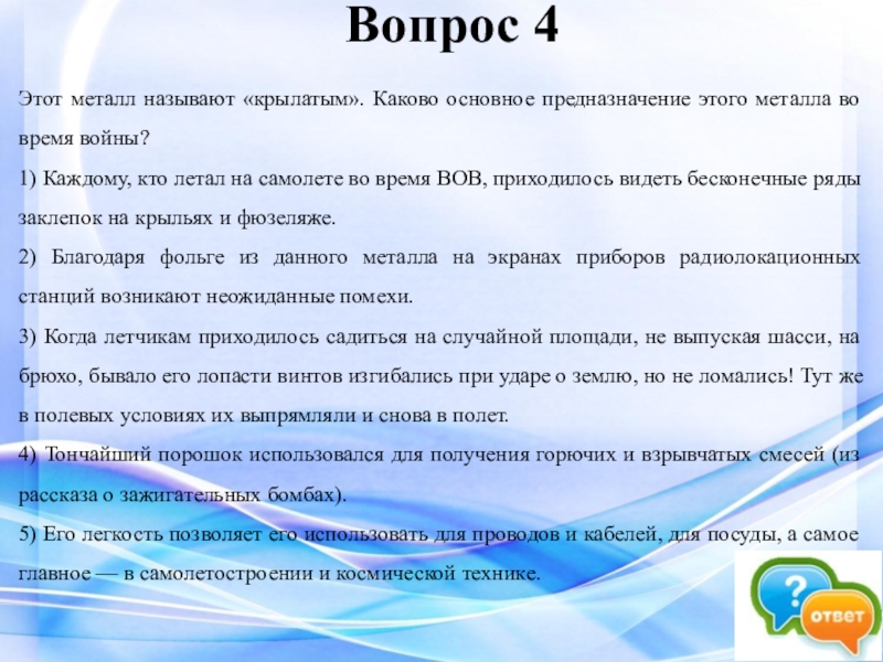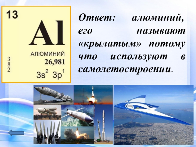 Слайд 10Ответ: алюминий, его называют «крылатым» потому что используют в самолетостроении.