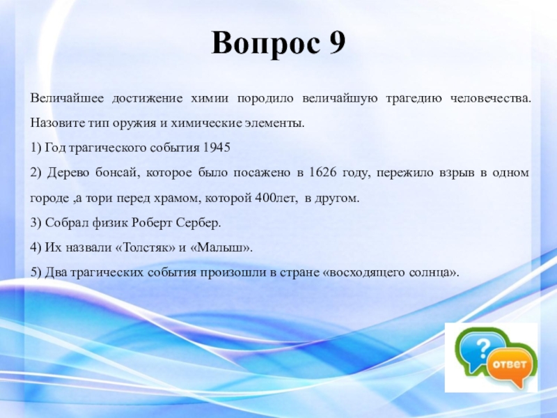 Слайд 39Ответ: ядерное оружие. Первая атомная (урановая) бомба была создана в США