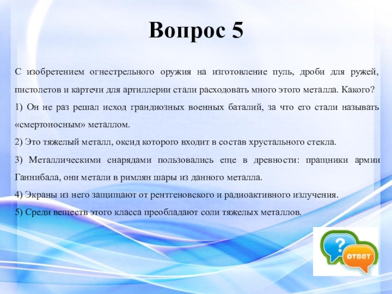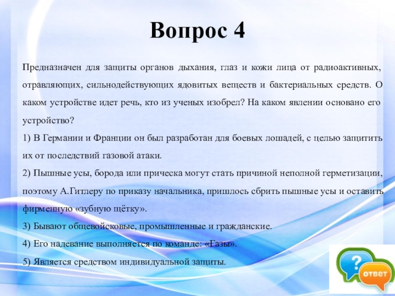 Слайд 29Ответ: противогаз, Н.Д. Зелинский в 1915 году. Зелинский предложил новый принцип
