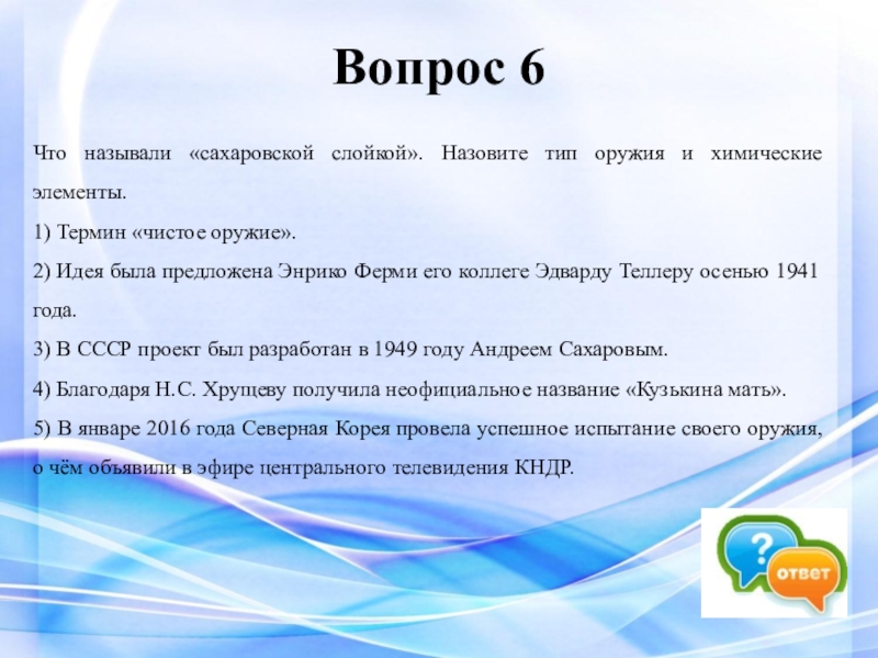Что называли «сахаровской слойкой». Назовите тип оружия и химические элементы.