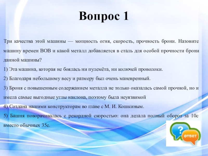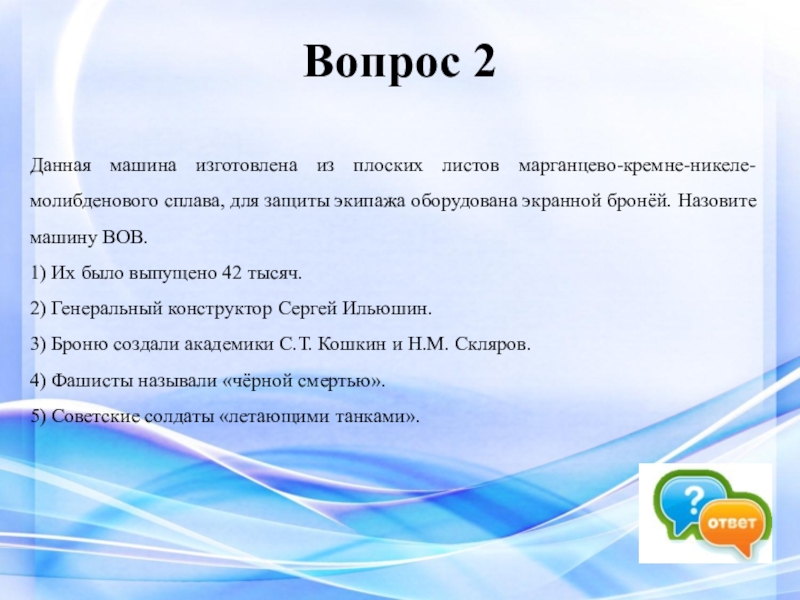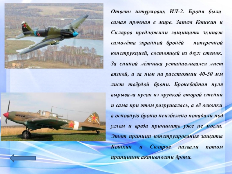 Слайд 25Ответ: штурмовик ИЛ-2. Броня была самая прочная в мире. Затем Кошкин