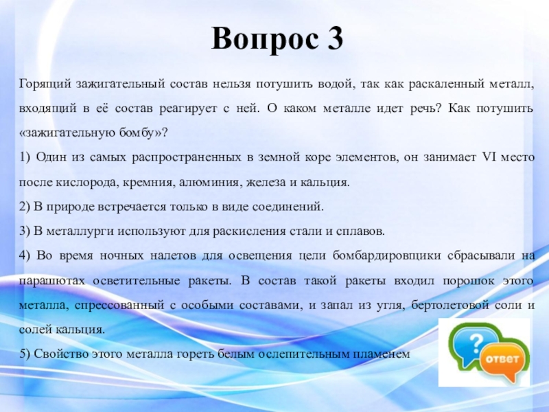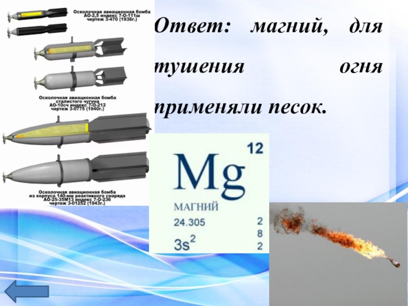Слайд 8Ответ: магний, для тушения огня применяли песок.