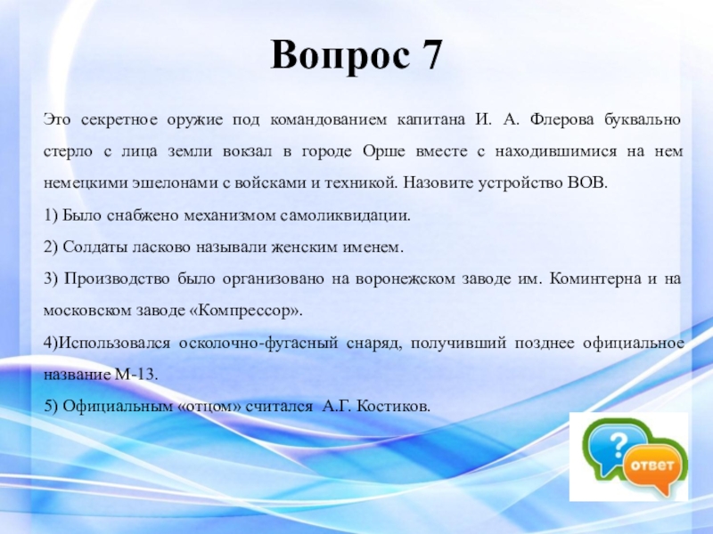 Слайд 35Ответ: «БМ-13»- знаменитая «катюша». Это было воистину оружие небывалой силы —