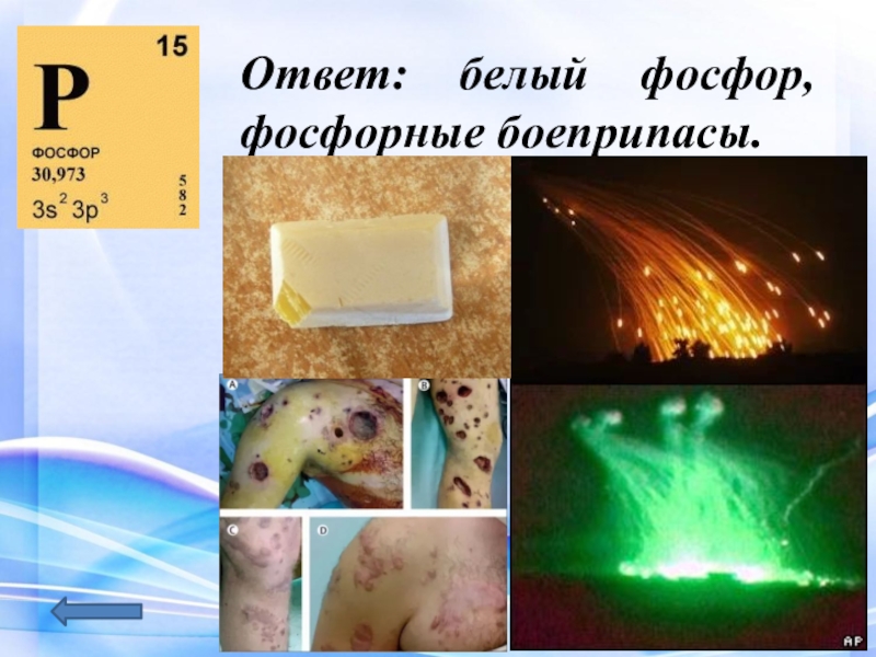 Слайд 27Ответ: белый фосфор, фосфорные боеприпасы.