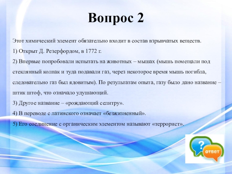 Слайд 6Ответ: азот. Ни одно взрывчатое вещество нельзя приготовить без азотной кислоты