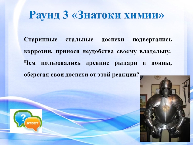 Слайд 41Ответ: Для предохранения от коррозии доспехи рыцари смазывали воском или жиром.
