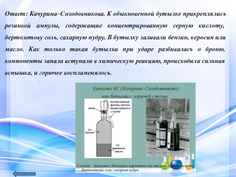 Слайд 31Ответ: Качурина–Солодовникова. К обыкновенной бутылке прикреплялись резинкой ампулы, содержащие концентрированную серную