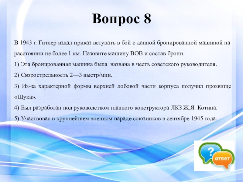 Слайд 37Ответ: ИС-3. Аббревиатура ИС означает «Иосиф Сталин» — официальное название серий