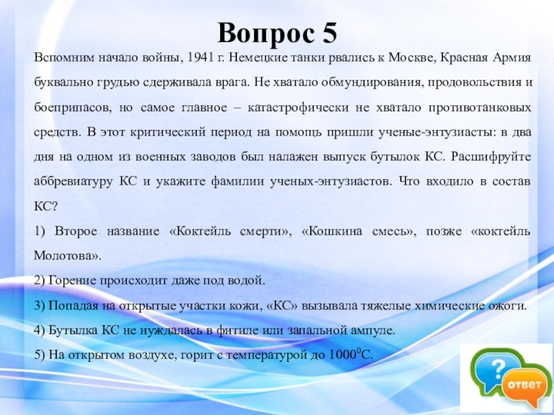 Красная Армия буквально грудью сдерживала врага. Не хватало обмундирования, продовольствия и боеприпасов, но самое главное – катастрофически не хватало противотанковых средств. В этот критический период на помощь пришли ученые-энтузиасты: в два дня на одном из военных заводов был налажен выпуск бутылок КС. Расшифруйте аббревиатуру КС и укажите фамилии ученых-энтузиастов. Что входило в состав КС?