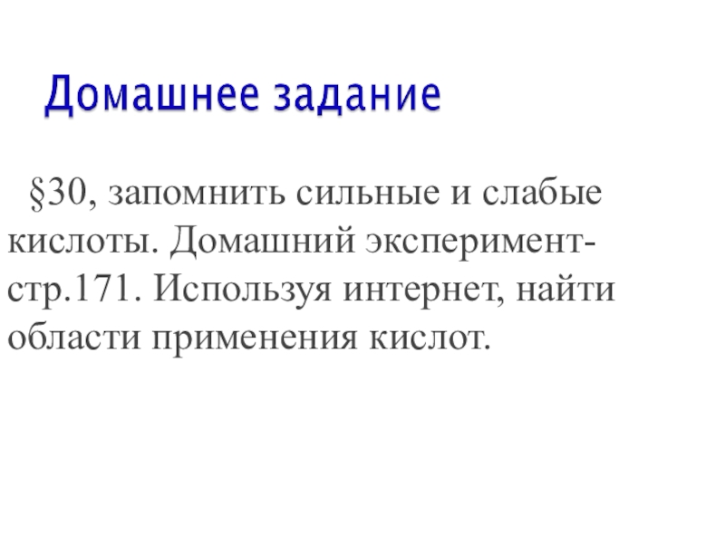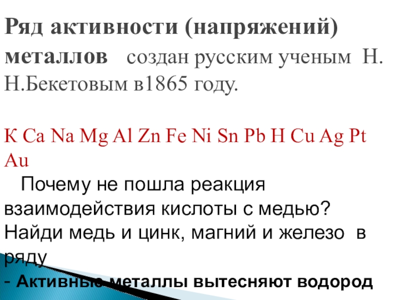 Цель: Создать условия для ознакомления учащимися свойствами кислот при взаимодействии с металлами, активностью металлов и силой кислот.