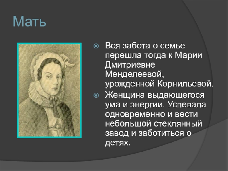 Вся забота о семье перешла тогда к Марии Дмитриевне Менделеевой, урожденной