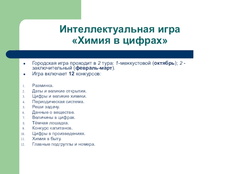 Городская ученическая интеллектуальная игра «Химия в цифрах».