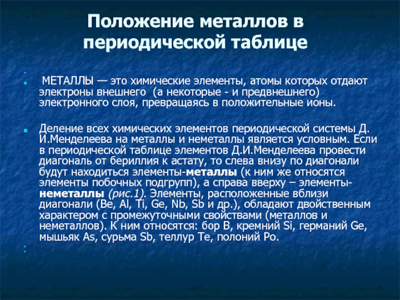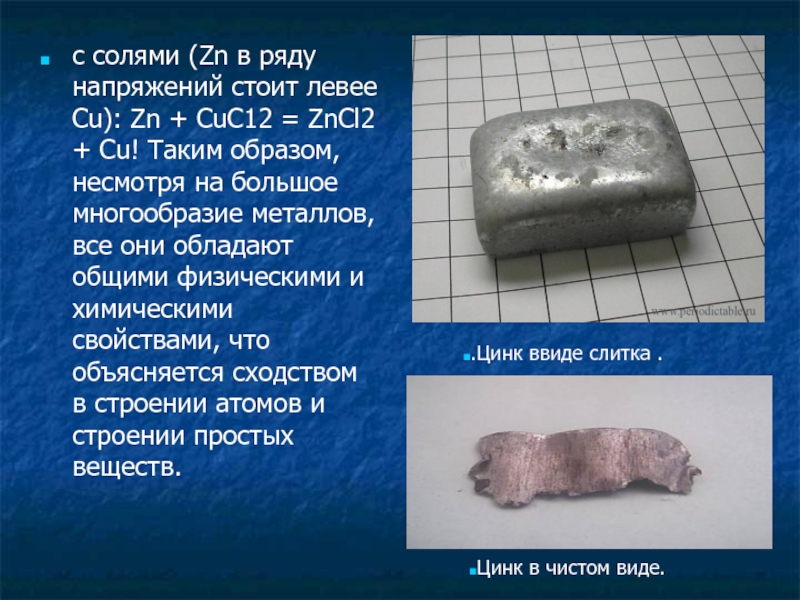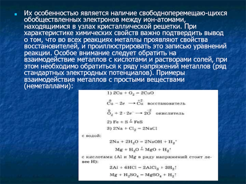 Свойство атомов металлов отдавать электроны явтяется их характерным химическим свойством и свидетельствует о том, что металлы проявляют восстановительные свойства. При характеристике физических свойств металлов следует отметить их общие свойства: электрическую проводимость, теплопроводность, металлический блеск, пластичность, которые обусловлены единым видом химической связи — металлической, и металлической кристаллической решетки.