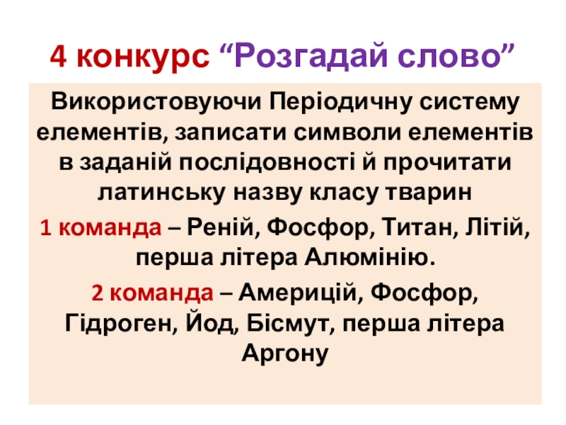1 команда – Реній, Фосфор, Титан, Літій, перша літера Алюмінію.