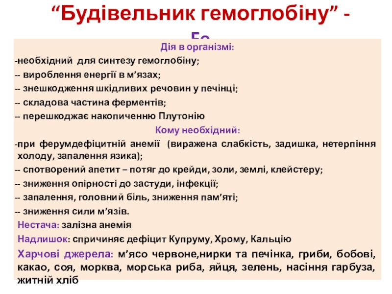 Слайд 14“Будівельник гемоглобіну” - Fe