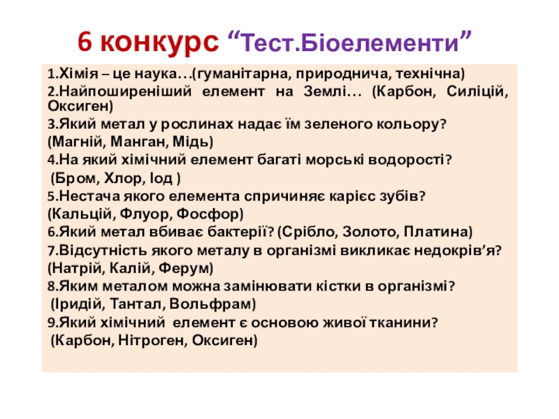 Слайд 106 конкурс “Тест.Біоелементи”
