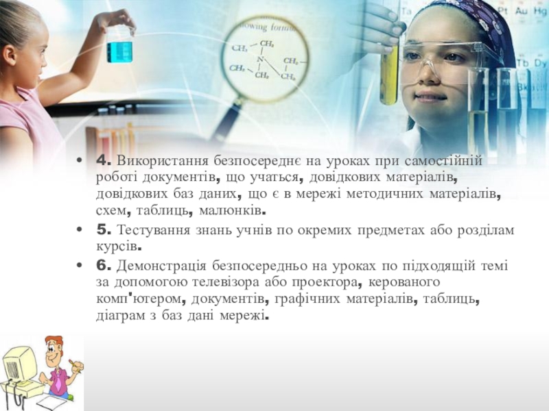 6. Демонстрація безпосередньо на уроках по підходящій темі за допомогою телевізора або проектора, керованого комп'ютером, документів, графічних матеріалів, таблиць, діаграм з баз дані мережі.