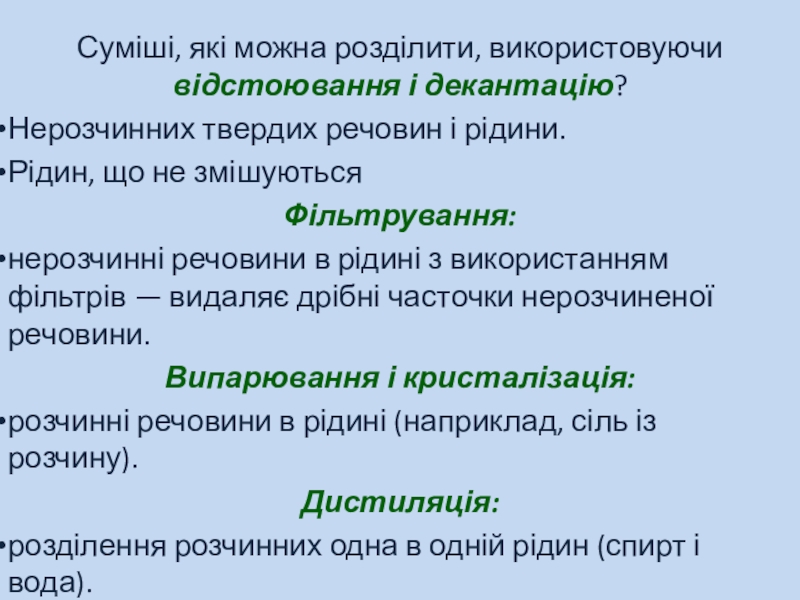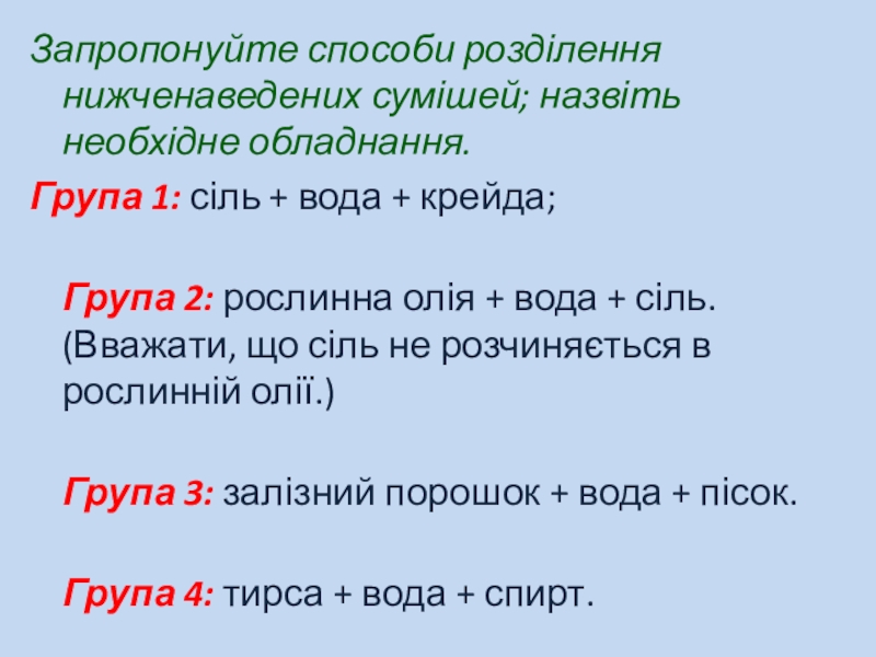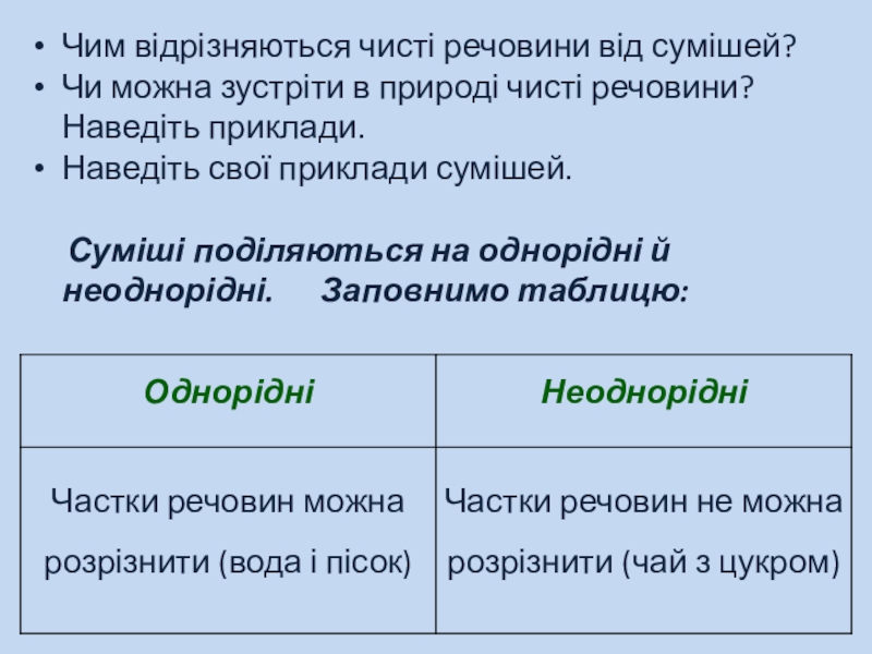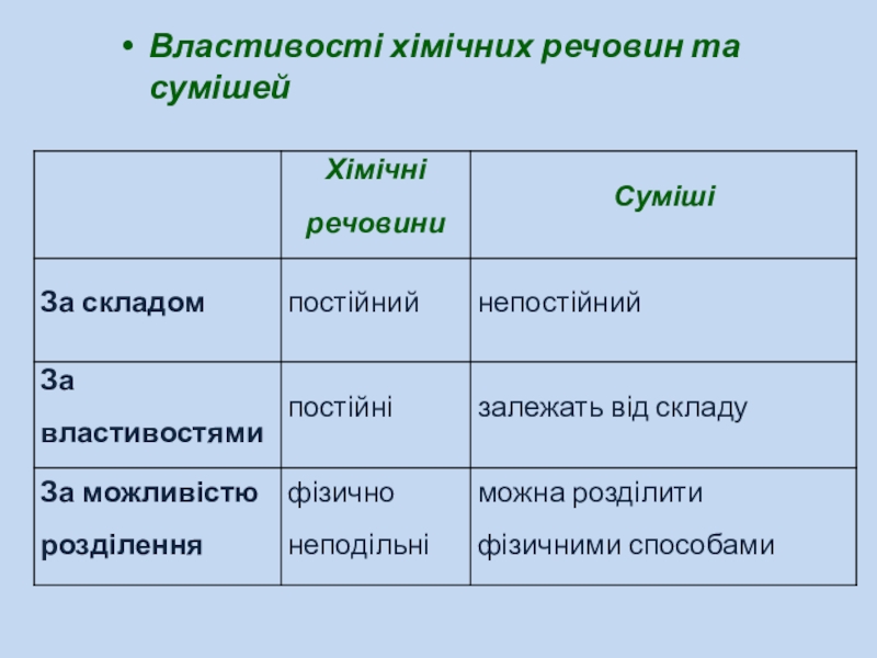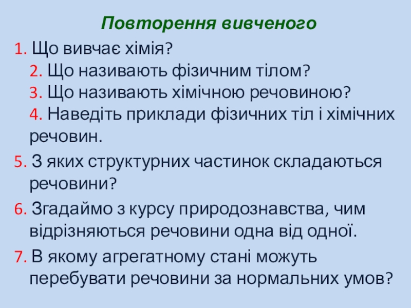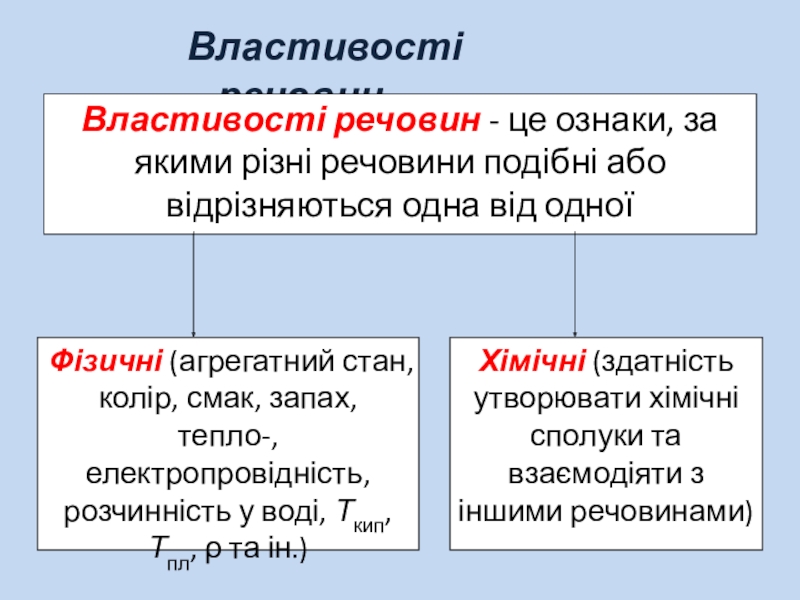 Фізичні (агрегатний стан, колір, смак, запах, тепло-, електропровідність, розчинність у воді, Ткип, Тпл, ρ та ін.)