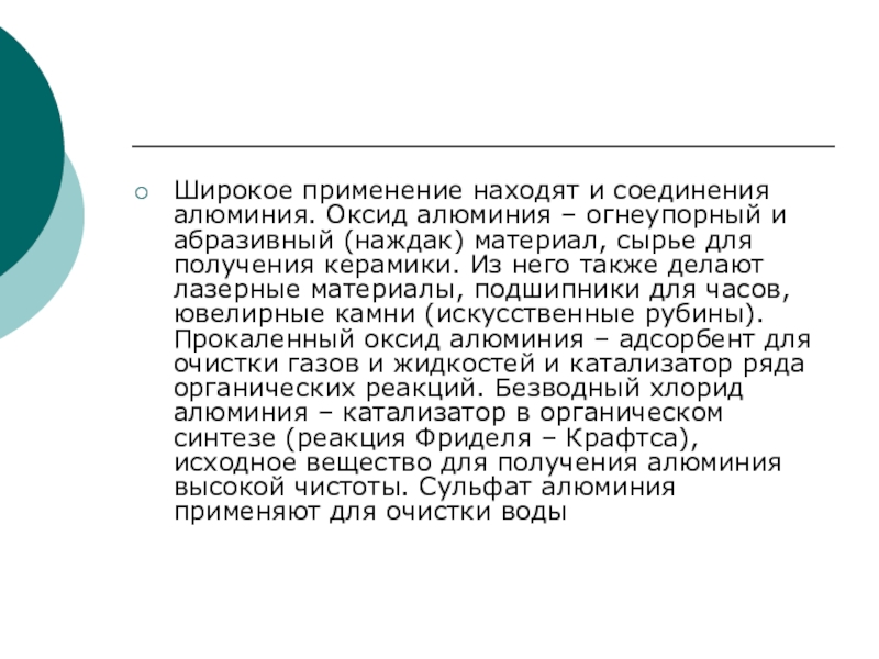 абразивный (наждак) материал, сырье для получения керамики. Из него также делают лазерные материалы, подшипники для часов, ювелирные камни (искусственные рубины). Прокаленный оксид алюминия – адсорбент для очистки газов и жидкостей и катализатор ряда органических реакций. Безводный хлорид алюминия – катализатор в органическом синтезе (реакция Фриделя – Крафтса), исходное вещество для получения алюминия высокой чистоты. Сульфат алюминия применяют для очистки воды