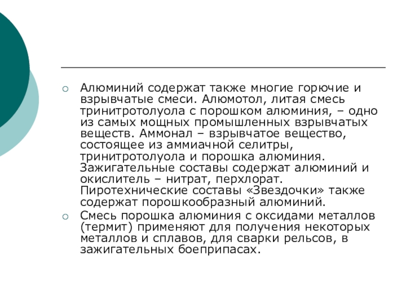 тринитротолуола с порошком алюминия, – одно из самых мощных промышленных взрывчатых веществ. Аммонал – взрывчатое вещество, состоящее из аммиачной селитры, тринитротолуола и порошка алюминия. Зажигательные составы содержат алюминий и окислитель – нитрат, перхлорат. Пиротехнические составы «Звездочки» также содержат порошкообразный алюминий.