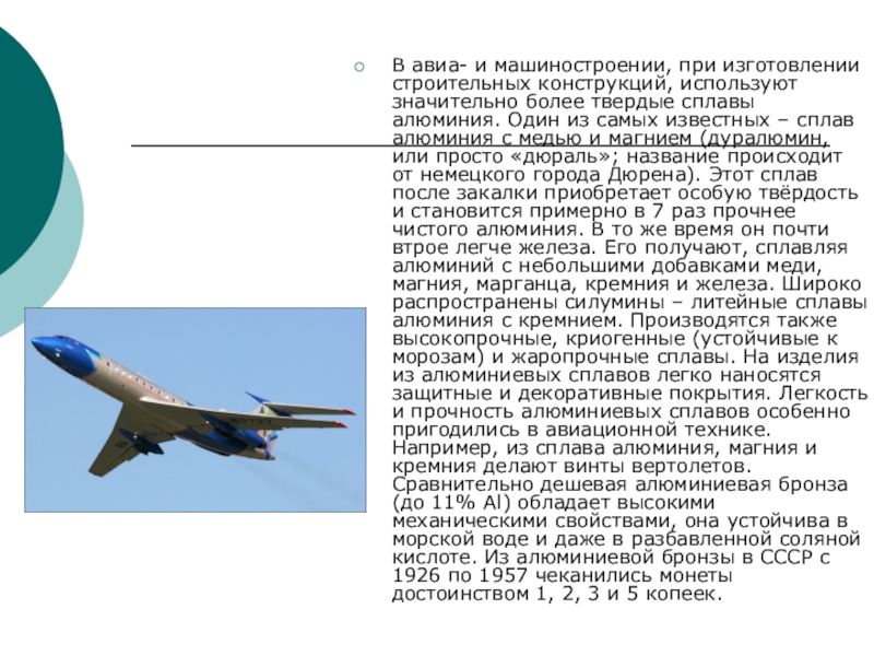 твердые сплавы алюминия. Один из самых известных – сплав алюминия с медью и магнием (дуралюмин, или просто «дюраль»; название происходит от немецкого города Дюрена). Этот сплав после закалки приобретает особую твёрдость и становится примерно в 7 раз прочнее чистого алюминия. В то же время он почти втрое легче железа. Его получают, сплавляя алюминий с небольшими добавками меди, магния, марганца, кремния и железа. Широко распространены силумины – литейные сплавы алюминия с кремнием. Производятся также высокопрочные, криогенные (устойчивые к морозам) и жаропрочные сплавы. На изделия из алюминиевых сплавов легко наносятся защитные и декоративные покрытия. Легкость и прочность алюминиевых сплавов особенно пригодились в авиационной технике. Например, из сплава алюминия, магния и кремния делают винты вертолетов. Сравнительно дешевая алюминиевая бронза (до 11% Al) обладает высокими механическими свойствами, она устойчива в морской воде и даже в разбавленной соляной кислоте. Из алюминиевой бронзы в СССР с 1926 по 1957 чеканились монеты достоинством 1, 2, 3 и 5 копеек.