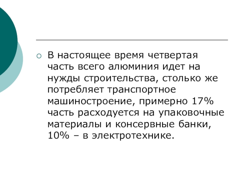 В настоящее время четвертая часть всего алюминия идет на нужды строительства, столько же потребляет транспортное машиностроение, примерно