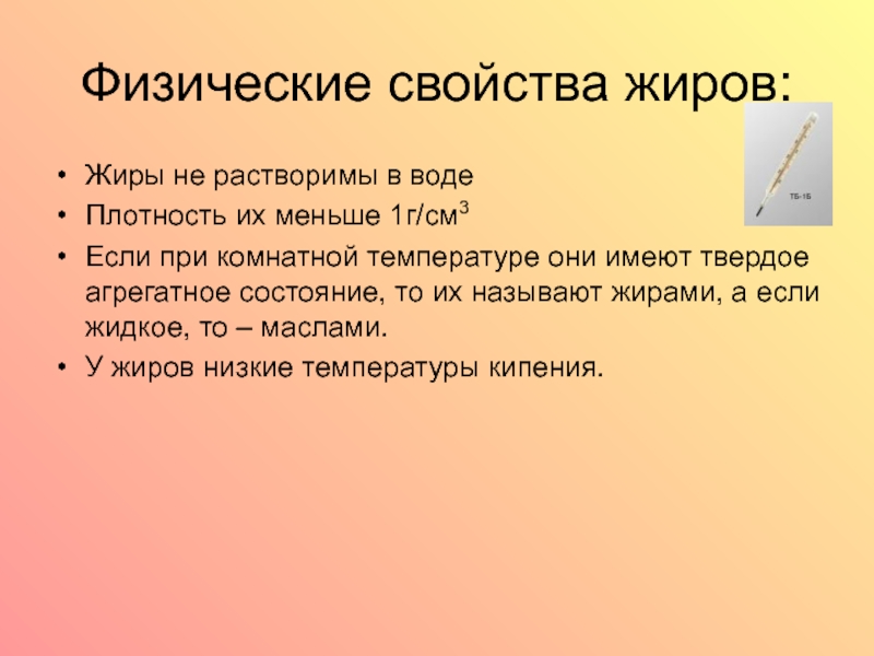 Физические свойства жиров:Жиры не растворимы в водеПлотность их меньше 1г/см3Если при комнатной температуре они имеют твердое агрегатное