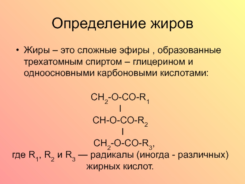 Определение жировЖиры – это сложные эфиры , образованные трехатомным спиртом – глицерином и одноосновными карбоновыми кислотами:CH2-O-CO-R1I