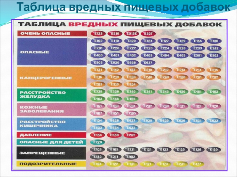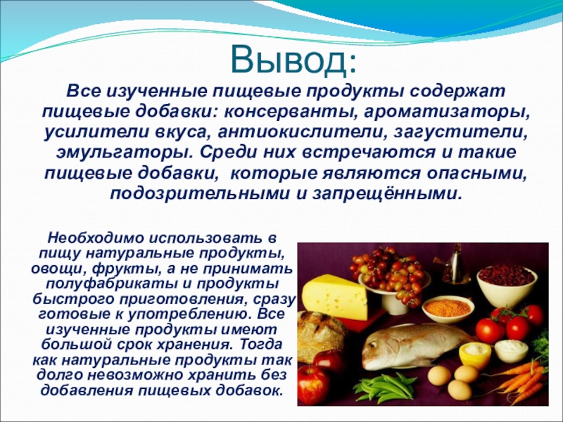 Необходимо использовать в пищу натуральные продукты, овощи, фрукты, а не принимать полуфабрикаты и продукты быстрого приготовления, сразу готовые к употреблению. Все изученные продукты имеют большой срок хранения. Тогда как натуральные продукты так долго невозможно хранить без добавления пищевых добавок.