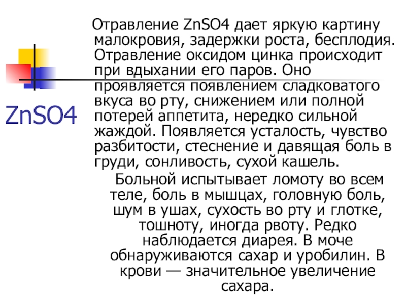 Отравление ZnSO4 дает яркую картину малокровия, задержки роста, бесплодия.