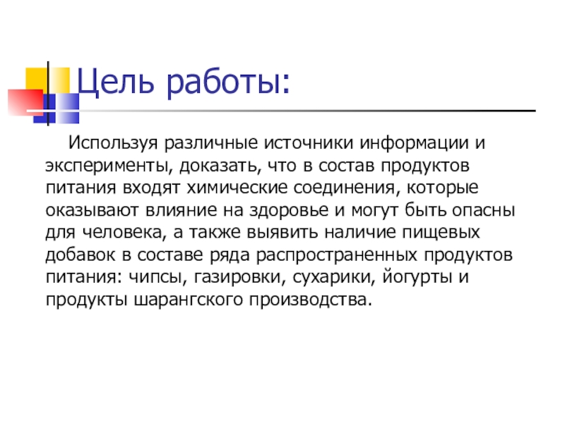 что в состав продуктов питания входят химические соединения, которые оказывают влияние на здоровье и могут быть опасны для человека, а также выявить наличие пищевых добавок в составе ряда распространенных продуктов питания: чипсы, газировки, сухарики, йогурты и продукты шарангского производства.