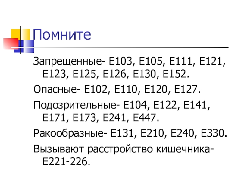Подозрительные- Е104, Е122, Е141, Е171, Е173, Е241, Е447.