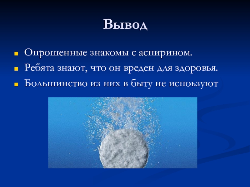Вывод: из опыта я доказала, что ацетилсалициловая кислота препятствует росту дрожжевых и плесневых грибов, а также некоторых бактерий.