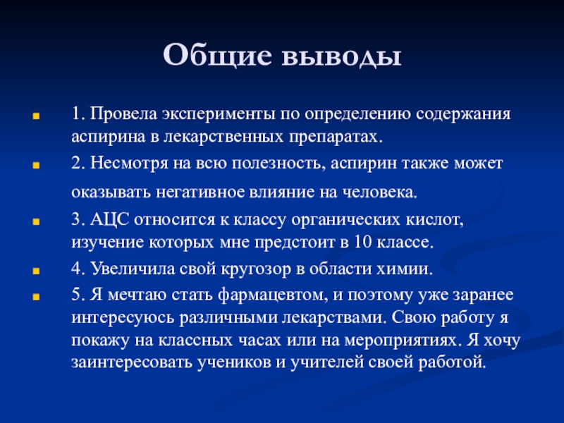 Вывод: я экспериментально доказала , что ацетилсалициловая кислота препятствует разложению мяса и отсутствие неприятного запаха.