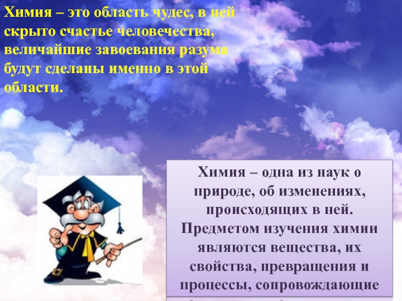 Химия – одна из наук о природе, об изменениях, происходящих в ней. Предметом изучения химии являются вещества, их свойства, превращения и процессы, сопровождающие эти превращения.