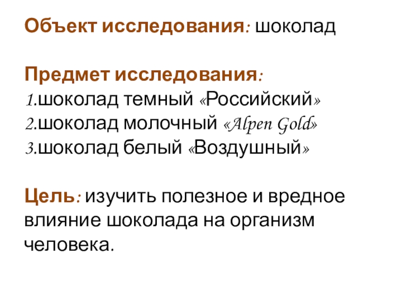 Цель: изучить полезное и вредное влияние шоколада на организм человека.