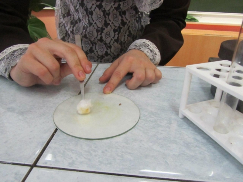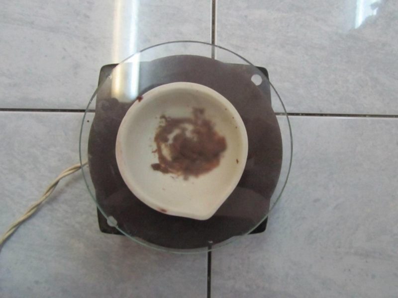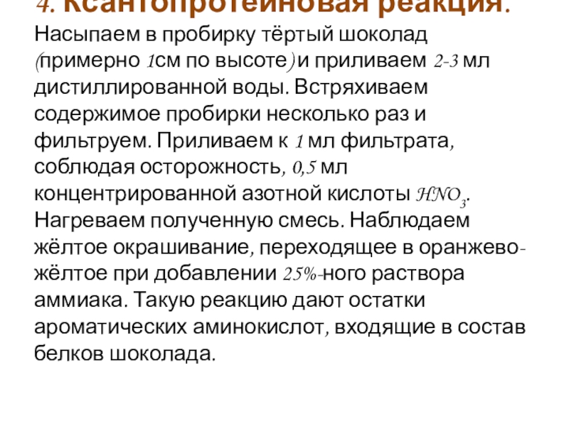 и приливаем 2-3 мл дистиллированной воды. Встряхиваем содержимое пробирки несколько раз и фильтруем. Приливаем к 1 мл фильтрата, соблюдая осторожность, 0,5 мл концентрированной азотной кислоты HNO3. Нагреваем полученную смесь. Наблюдаем жёлтое окрашивание, переходящее в оранжево-жёлтое при добавлении 25%-ного раствора аммиака. Такую реакцию дают остатки ароматических аминокислот, входящие в состав белков шоколада.