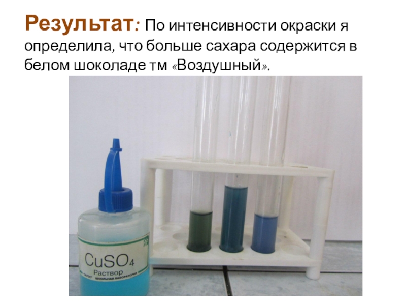Слайд 36Результат: По интенсивности окраски я определила, что больше сахара содержится в
