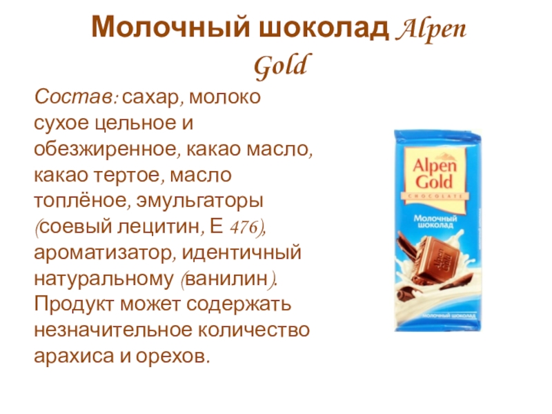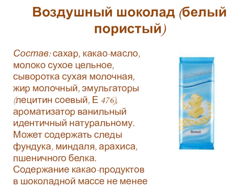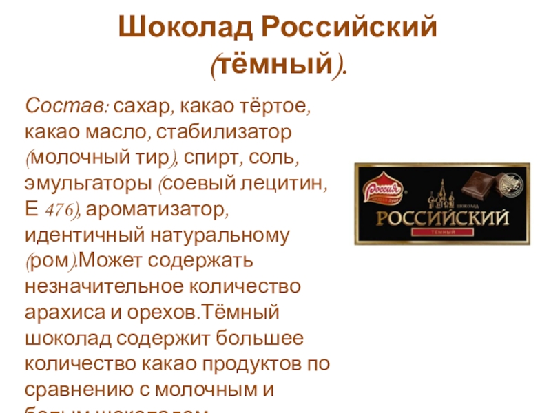 других пищевых компонентов. Натуральный шоколад – это шоколад, содержащий только какао-продукты (какао-бобы, какао-масло) и сахар.