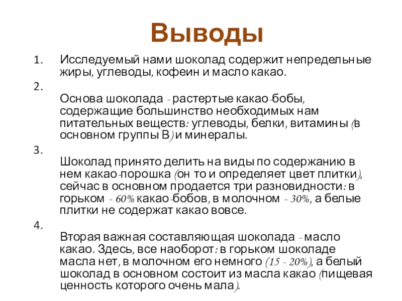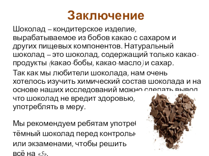 Так как мы любители шоколада, нам очень хотелось изучить химический состав шоколада и на основе наших исследований можно сделать вывод, что шоколад не вредит здоровью, если его употреблять в меру.