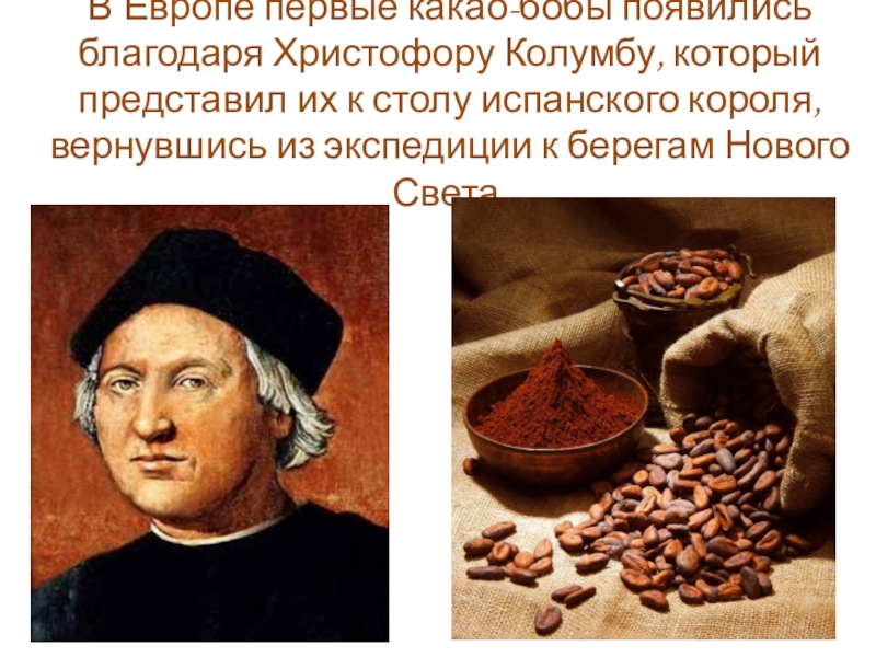 Слайд 13В Европе первые какао-бобы появились благодаря Христофору Колумбу, который представил их