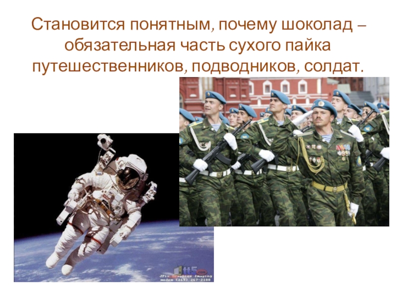 Слайд 7Становится понятным, почему шоколад – обязательная часть сухого пайка путешественников, подводников,
