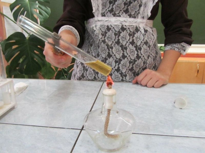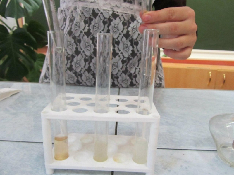 Снимаем масло со стекла ватой, помещаем её в другую пробирку и приливаем 2 мл спирта. Получаем жёлтый раствор. Аккуратно, чтобы не попала вата, переливаем его в другую пробирку и добавляем 2-3 капли раствора перманганата калия KMnO4. Происходит восстановление KMnO4содержащимися в масле непредельными жирами до бурого MnO2, выпадающего в осадок.