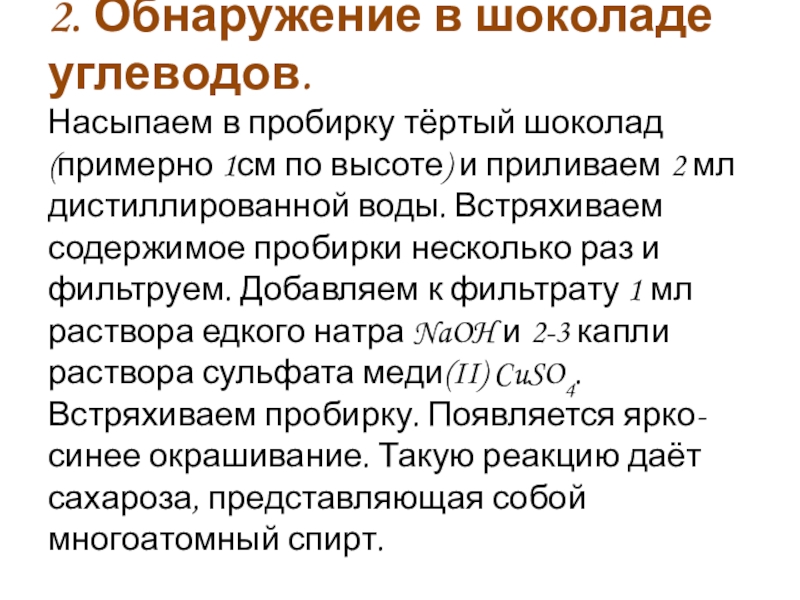 Слайд 322. Обнаружение в шоколаде углеводов.