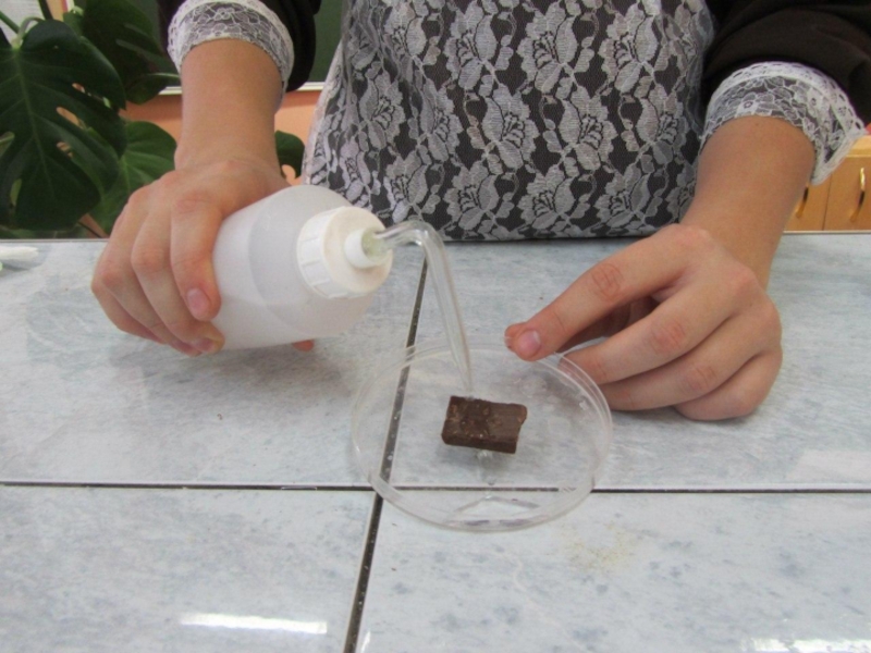 фольгу и помещаем на 1-2 недели в холодильник (не в морозильное отделение). В результате на поверхности шоколада появился налёт. Это выступили кристаллики сахарозы. Смываем налёт 3-5 мл дистиллированной воды, добавляем к смыву 1 мл раствора щёлочи и 1-2 капли раствора сульфата меди (II) CuSO4. Появляется характерное ярко-синее окрашивание.