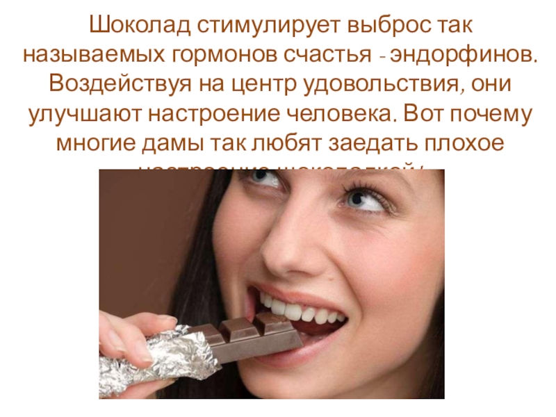 Слайд 23Шоколад стимулирует выброс так называемых гормонов счастья - эндорфинов. Воздействуя на