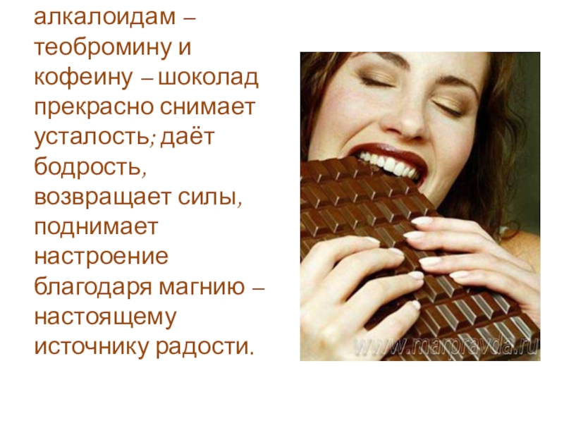 Слайд 6Благодаря активным веществам-алкалоидам – теобромину и кофеину – шоколад прекрасно снимает