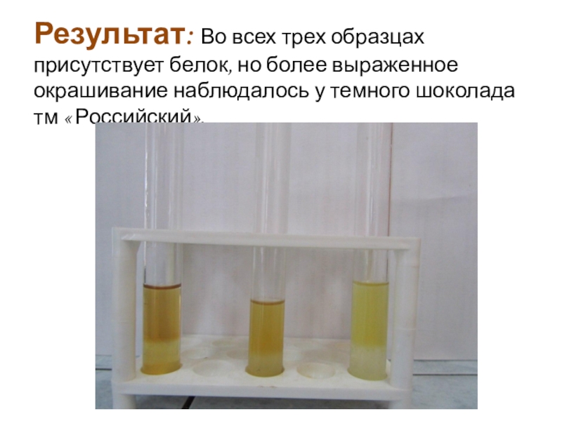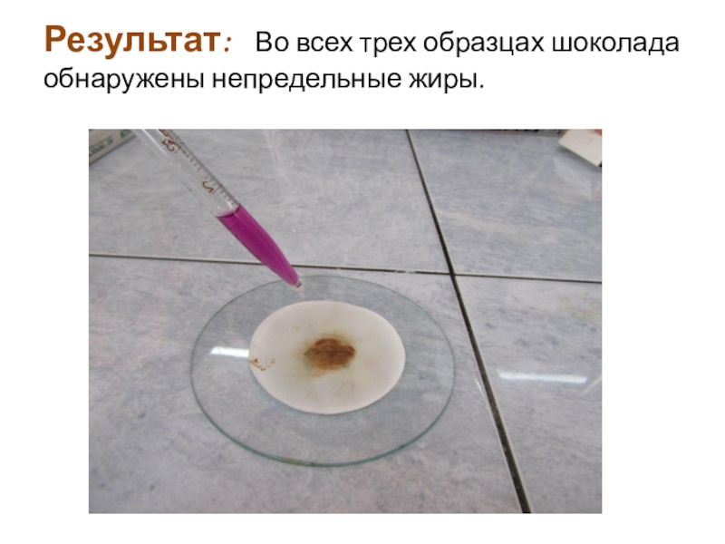 Слайд 31Результат: Во всех трех образцах шоколада обнаружены непредельные жиры.
